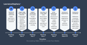 Within nine business days, the hedge fund’s team had changed the position from a complete unknown to obtaining more than 80% of the value of lost USDC, the hedge fund being satisfied that the balance had been dissipated and/or not worth the cost to pursue.